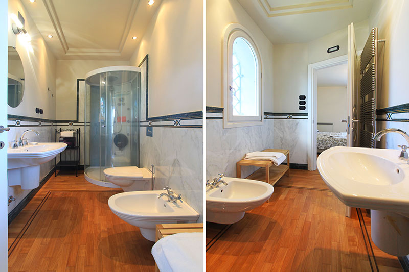 Ersten Stockwerk: Doppelzimmer mit privatem Badezimmer mit Badewanne und Zugang zum Balkon, Doppelzimmer mit privatem Badezimmer mit Dusche und Zugang zum Balkon, Doppelzimmer mit zwei Einzelbetten, privatem Badezimmer mit Dusche und Zugang zum Balkon, großer Balkon,