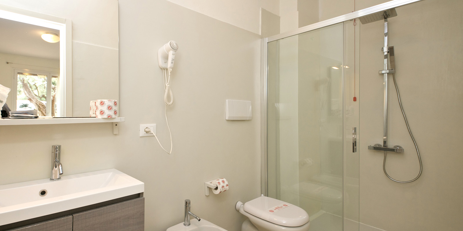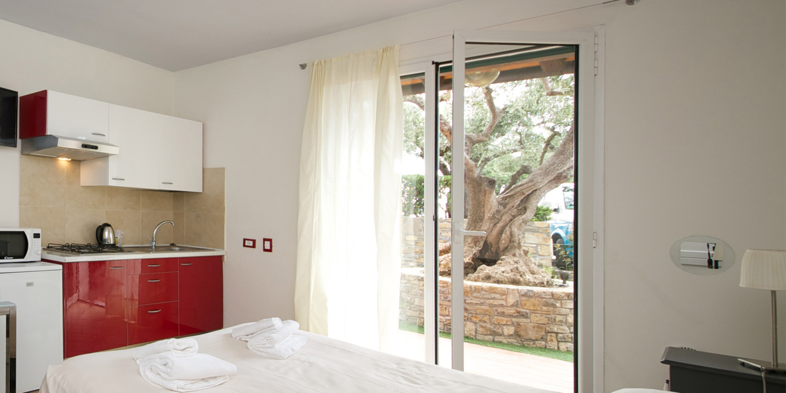 Ausstattung: Erdgeschoss oder 1. Obergeschoss. Wohnzimmer mit Kochnische, Doppelbett oder 2 Einzelbetten, Schlafcouch. Bad mit Dusche/WC/Bidet. Balkon bzw. Außenbereich mit Gartenmöbeln.