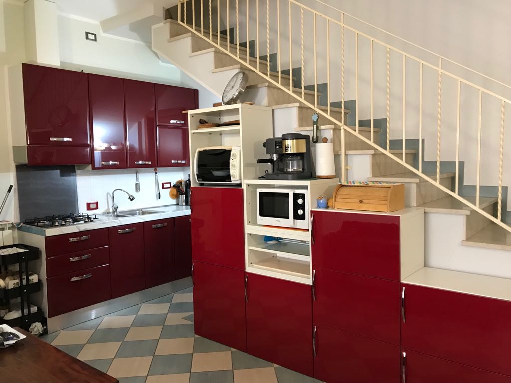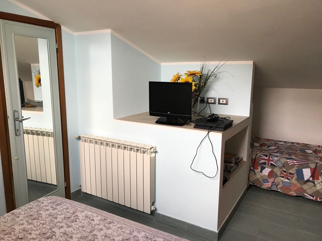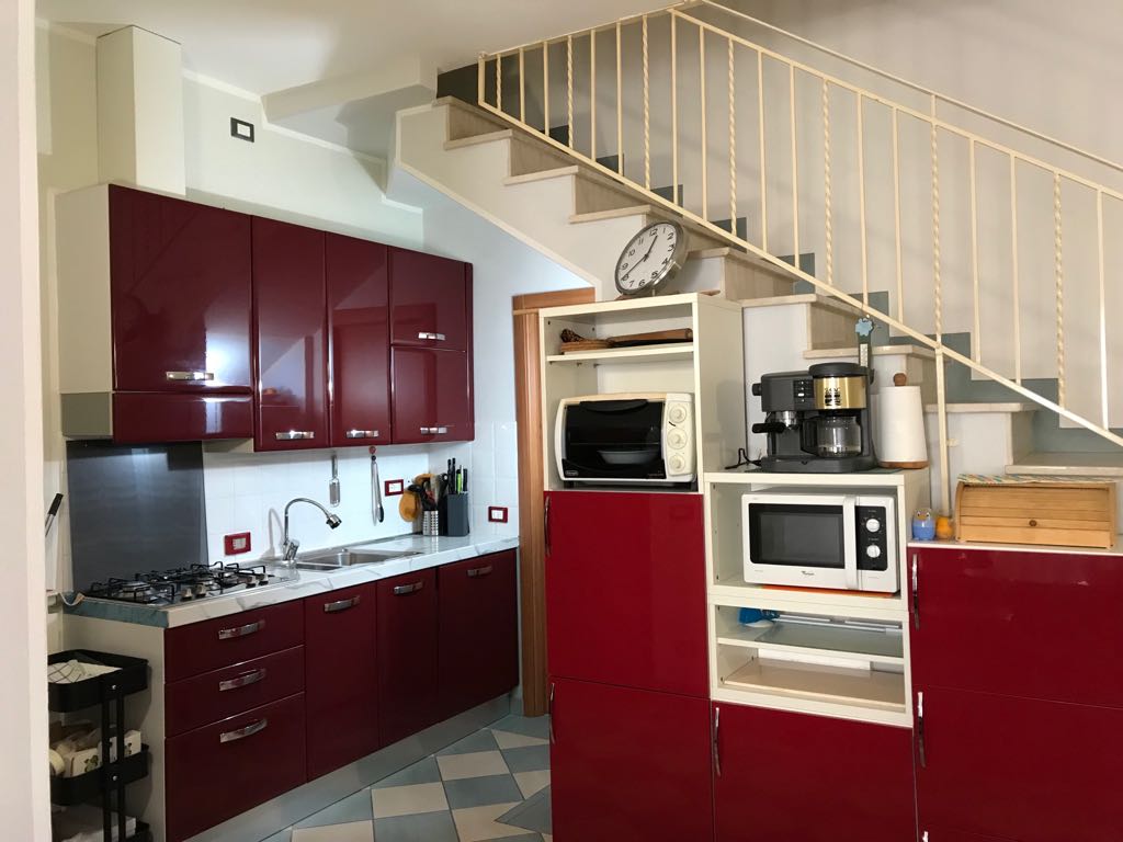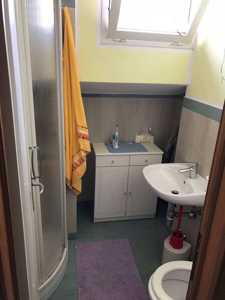 Ausstattung: Die Ferienwohnung von ca. 90 m² ist für 4/7 Personen. Sie befindet sich in der 2. Etage, sie ist modern und gemütlich eingerichtet. Die Wohnfläche der Wohnung ist auf 2 Etagen verteilt: großes Wohnzimmer mit Schlafsofas, Balkon mit Meerblick (seitlich), 1 Doppelzimmer, Bad mit Dusche. Eine Treppe führt zum Dachgeschoss, in dem eine Küche mit Spülmaschine, Esstisch , dann 1 Doppelzimmer und 1 Bad mit Dusche sich befindet. Eine Waschmaschine und ein TV sind vorhanden.